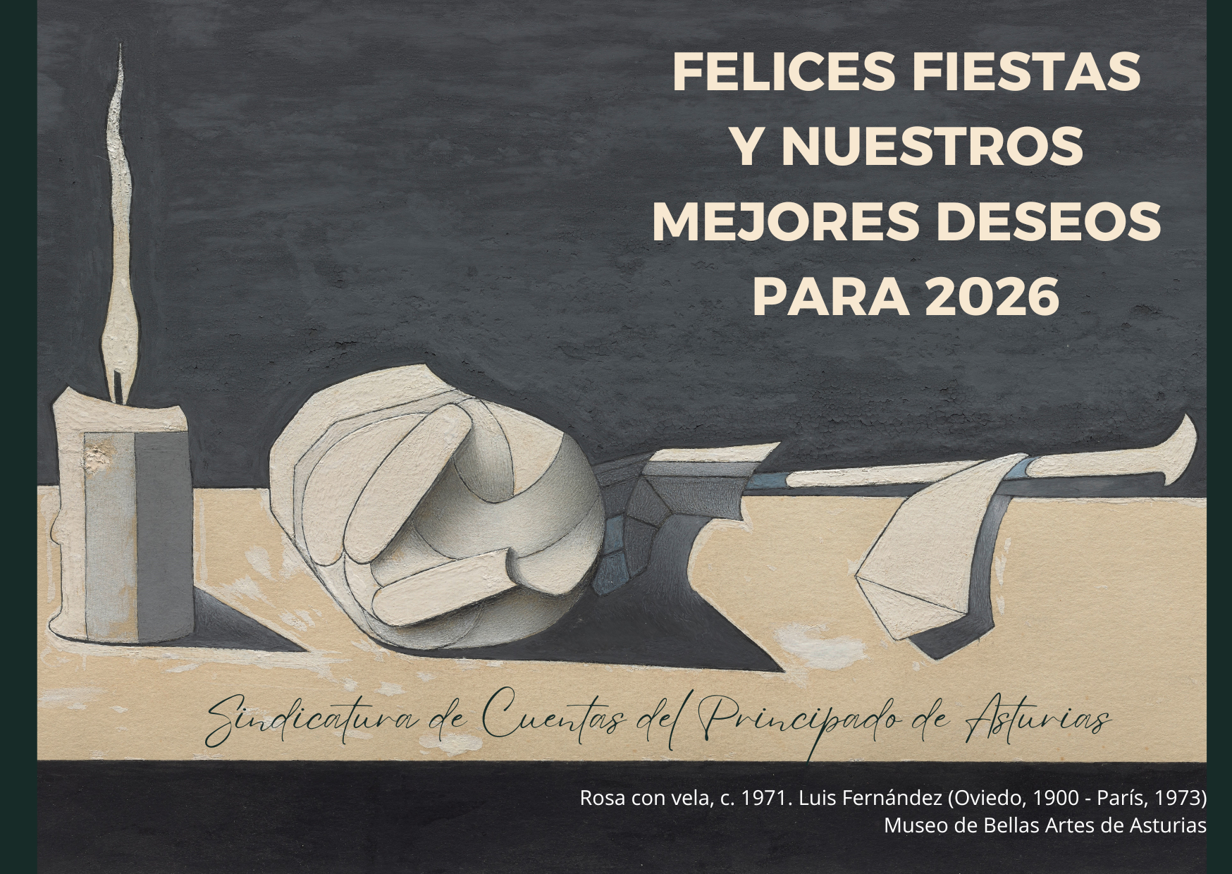 Felices fiestas y nuestros mejores deseos para 2026. La Sindicatura de Cuentas del Principado de Asturias elige un cuadro de Luis Fernández, titulado Rosa con vela, para ilustrar su postal navideña. La obra forma parte del fondo del Museo de Bellas Artes de Asturias.