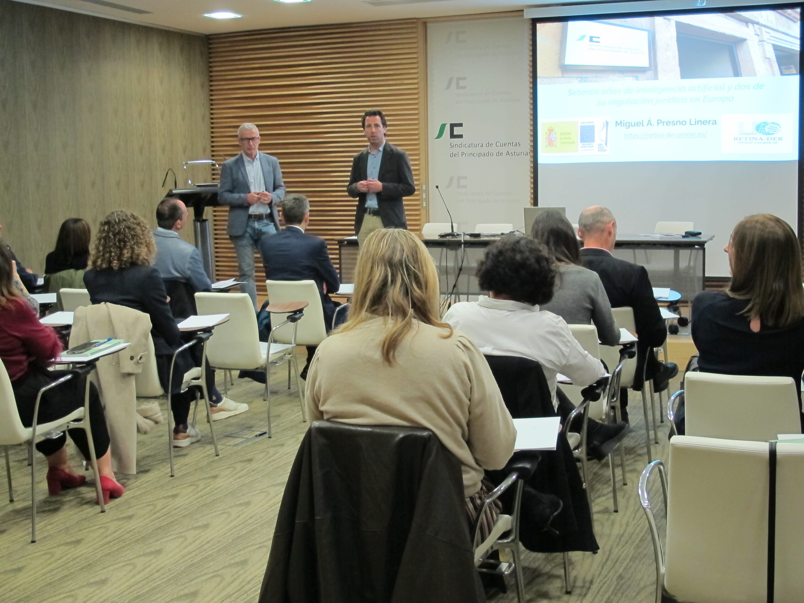 La Sindicatura de Cuentas del Principado de Asturias organizó hoy y ayer unas jornadas formativas para su personal tituladas «Inteligencia artificial, entorno jurídico y gobierno del dato». El curso lo inauguró Miguel Ángel Presno Linera, catedrático de Derecho Constitucional de la Universidad de Oviedo y responsable del grupo de investigación internacional sobre los retos de la inteligencia artificial para el Estado social y democrático de Derecho (RETINA-DER). Impartió la conferencia «Setenta años de inteligencia artificial y dos de su regulación jurídica en Europa».